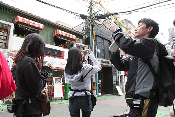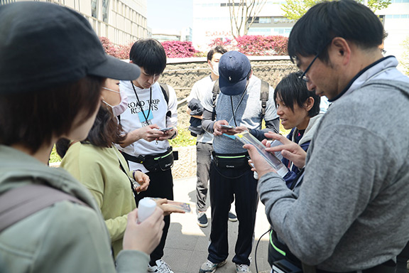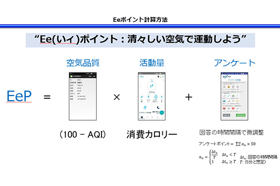 大気環境の実測データを基に、機械学習の手法を用いて数時間後の空気品質を予測する技術を開発し、それを実装したアプリケーションを用いたオリエンテーリングを実施しました。オリエンテーリングでは、空気品質と活動量を掛け合わせた大気質累積(暴露)量をEeP(Environment X Exercise Point)として可視化し、参加者はEePが多くなる(空気品質のより良い場所でよりたくさん活動する)ようなルートを探しながら、福岡市内に設置した数か所のチェックポイントを回りました。その間、小型IoT環境センサーにより大気環境を計測、さらにセンサーでは測ることができない周辺環境の知覚や主観の情報をアンケート形式で取得しました。